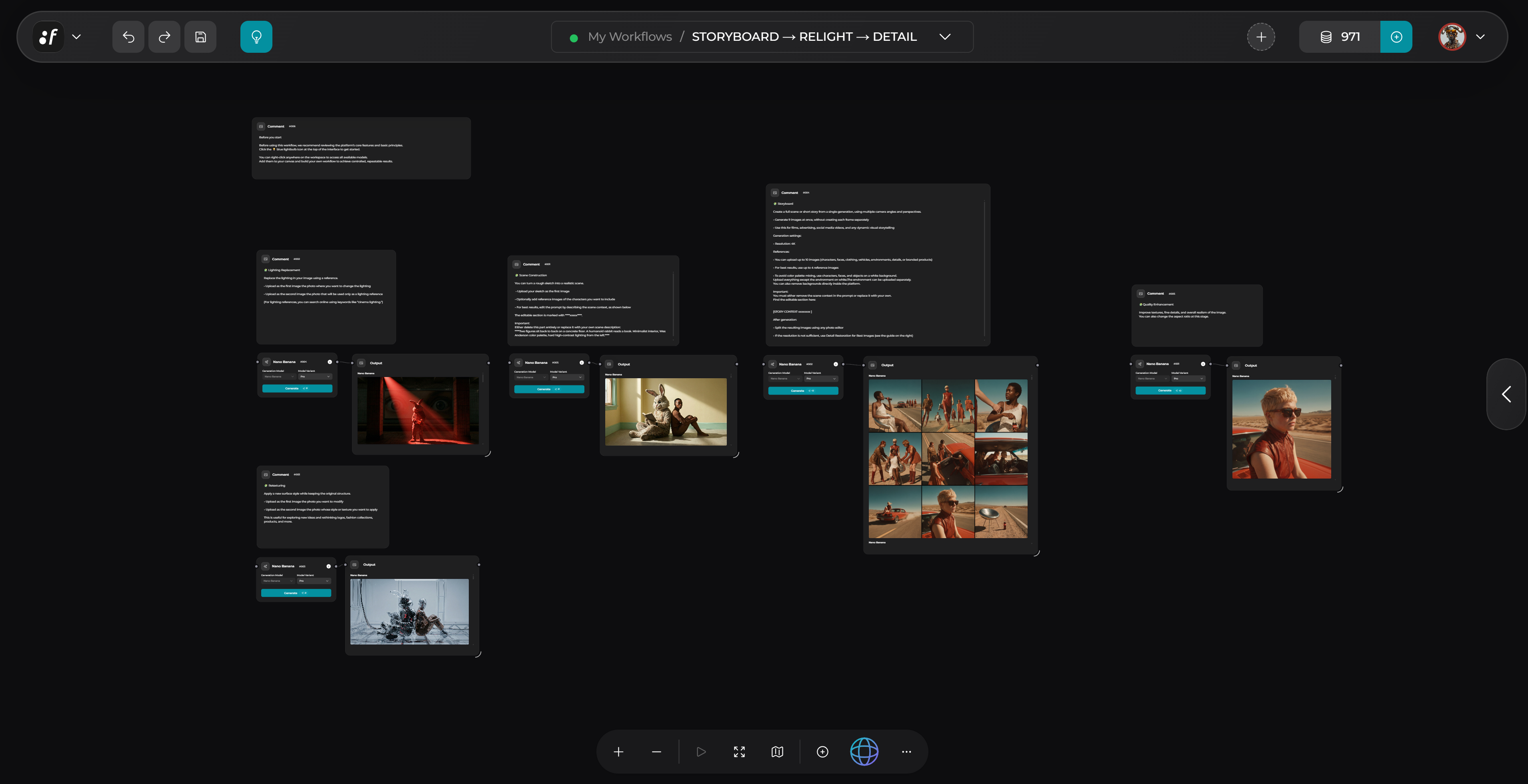 This workflow is designed for film and advertising production. It combines cinematic storyboarding, relighting, scene construction from sketches, and retexturing into a single, controlled process. Build scenes with consistent lighting, materials, and camera logic for professional, repeatable results.